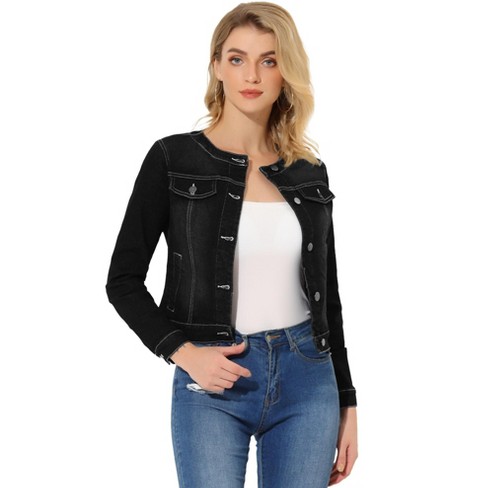 Womens black collarless jacket shop
