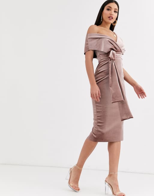 Asos design fallen shoulder midi pencil dress with tie detail shop