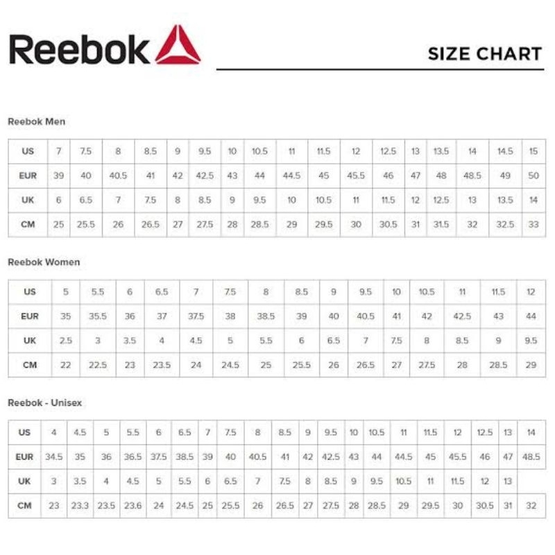 Size chart shoes reebok shop