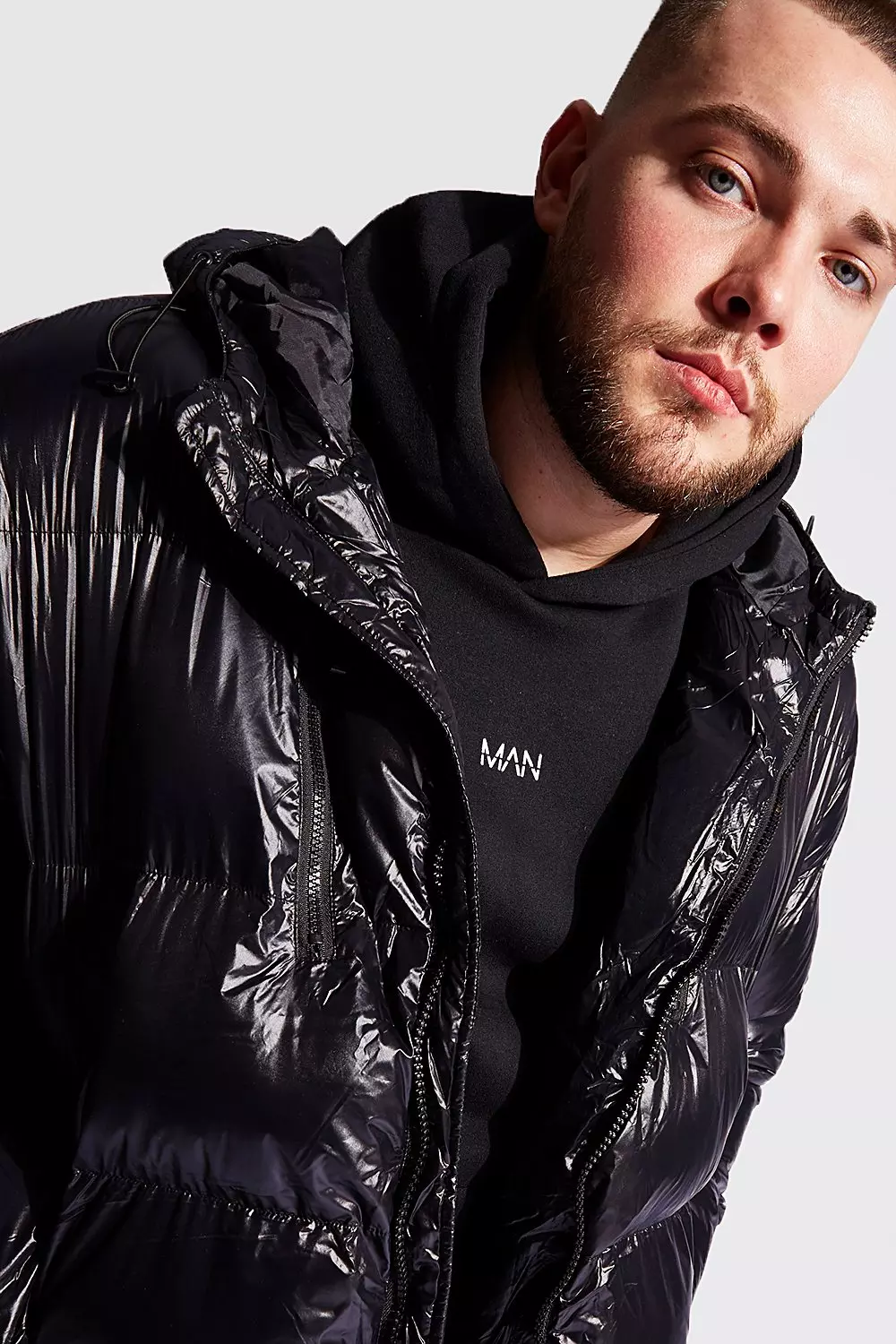 Black wet look puffer shop